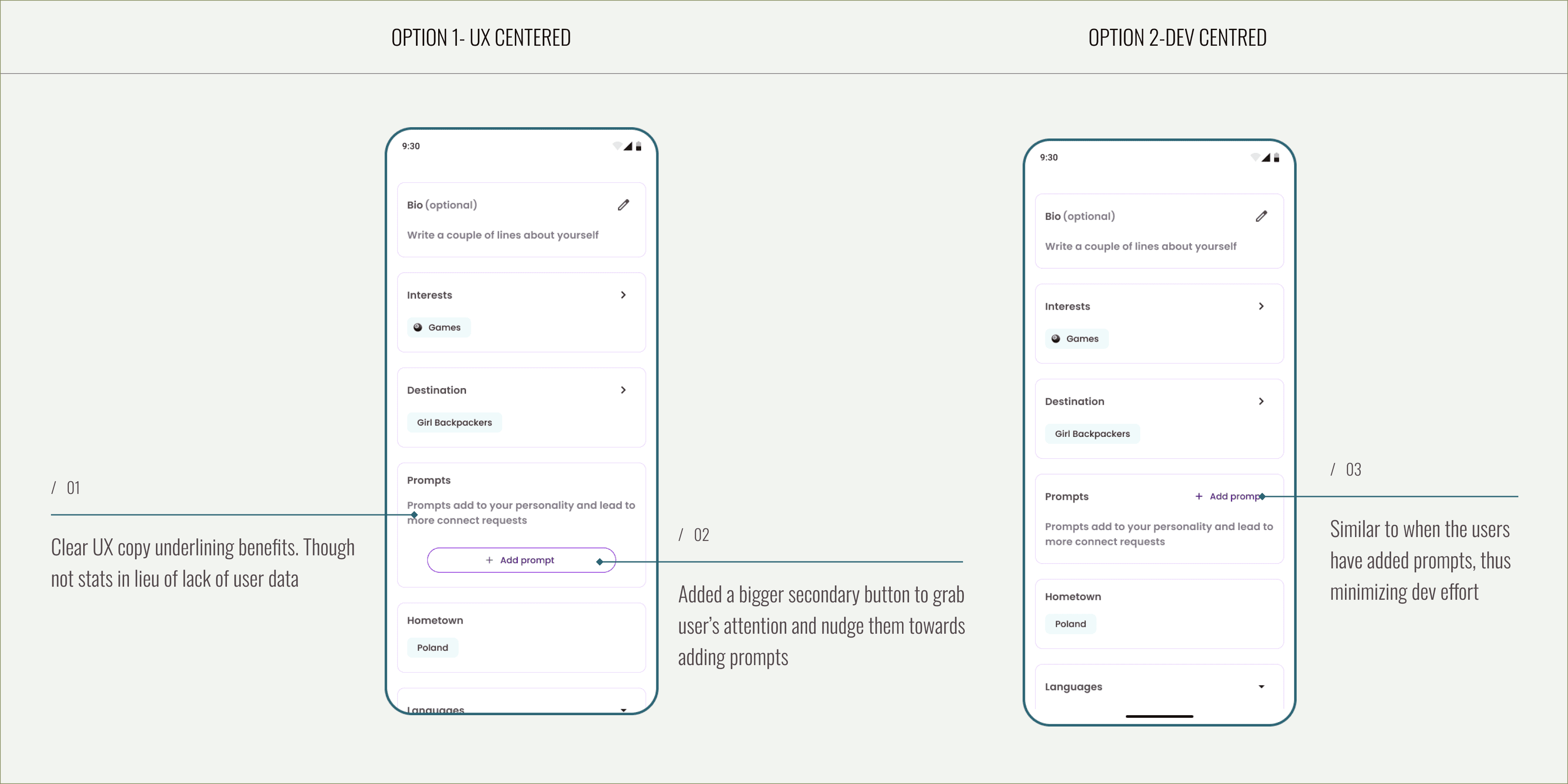 I designed two solutions for the prompt edge case — one prioritizing user experience and another optimized for development feasibility. Given time constraints, we proceeded with the latter for implementation.