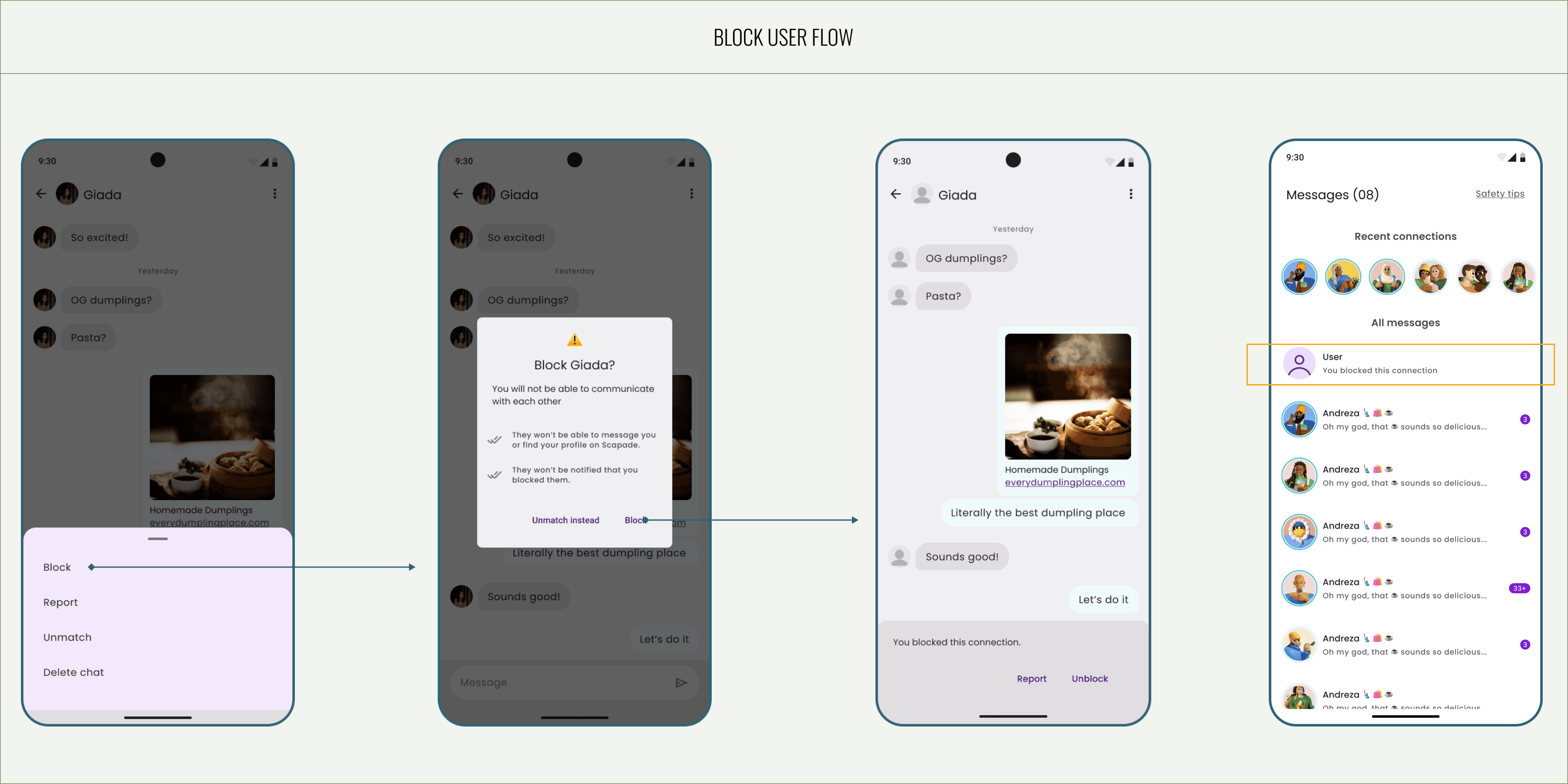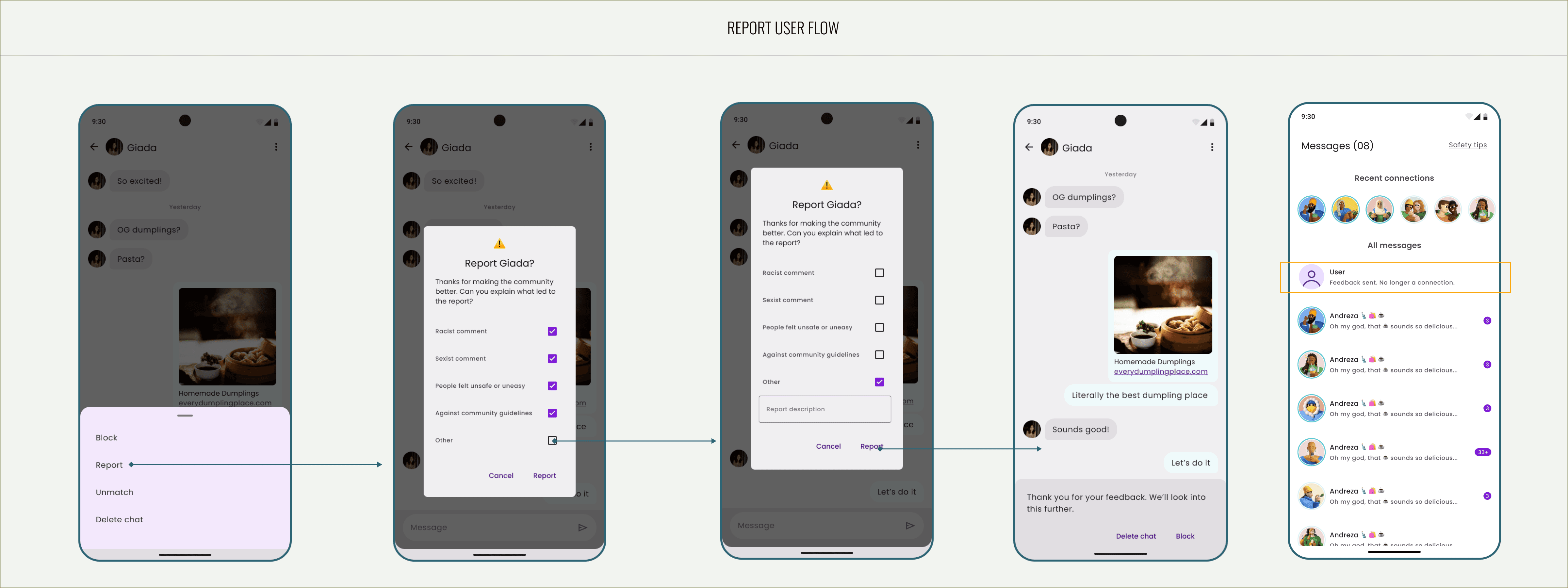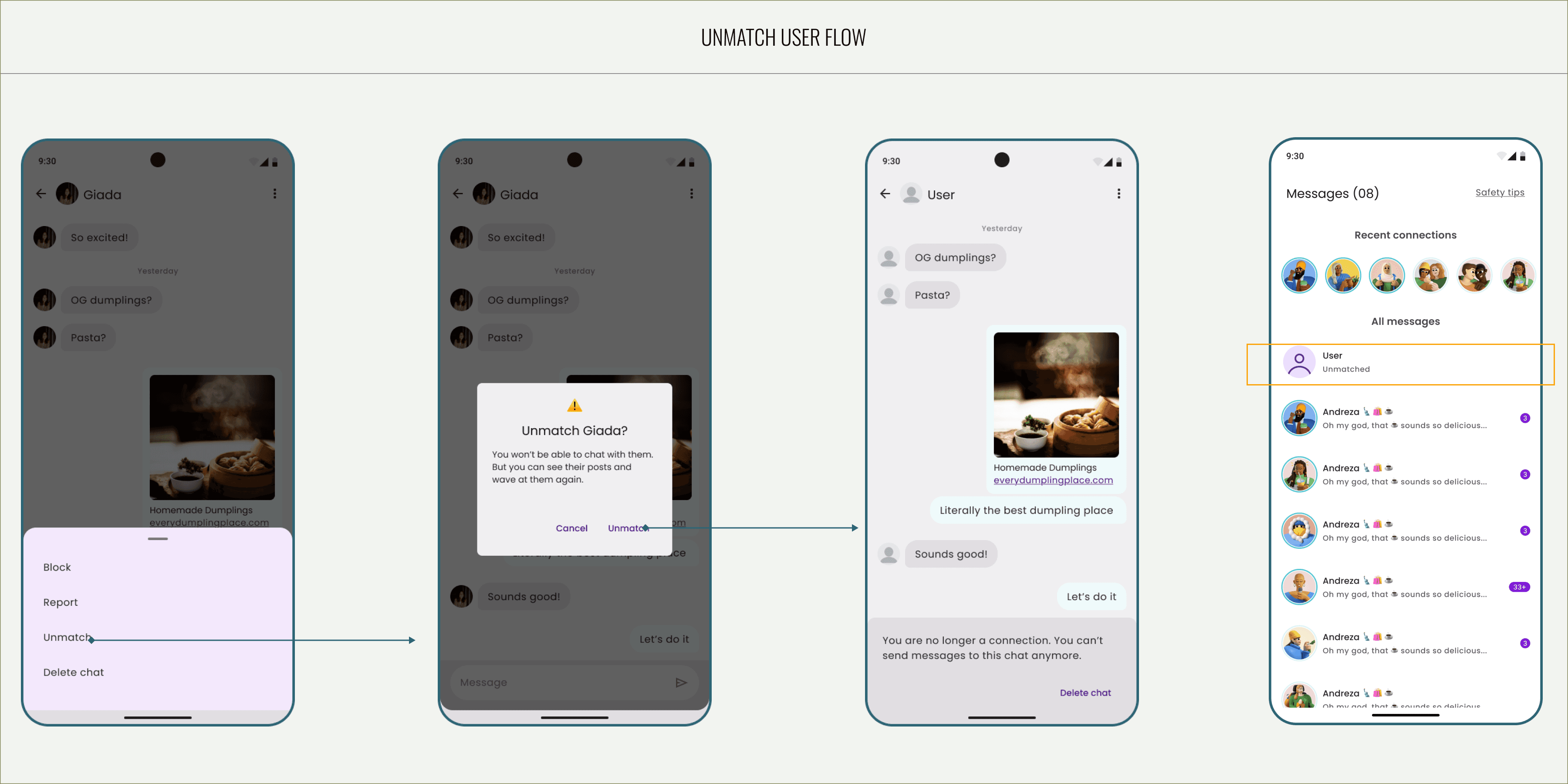 When designing the Report, Unmatch, and Delete flow, my priority was to ensure users felt in control without breaking their sense of safety or comfort. I established a clear hierarchy where “Unmatch” and “Delete” are treated as reversible, self-contained actions, while “Report” leads to a more guided flow that gathers contextual feedback. Each action was accompanied by a confirmation prompt to prevent accidental selections, while microcopy was written in a neutral, empathetic tone to avoid escalating emotional tension. The structure also ensures that users understand the consequences of their actions, helping maintain both clarity and emotional trust.