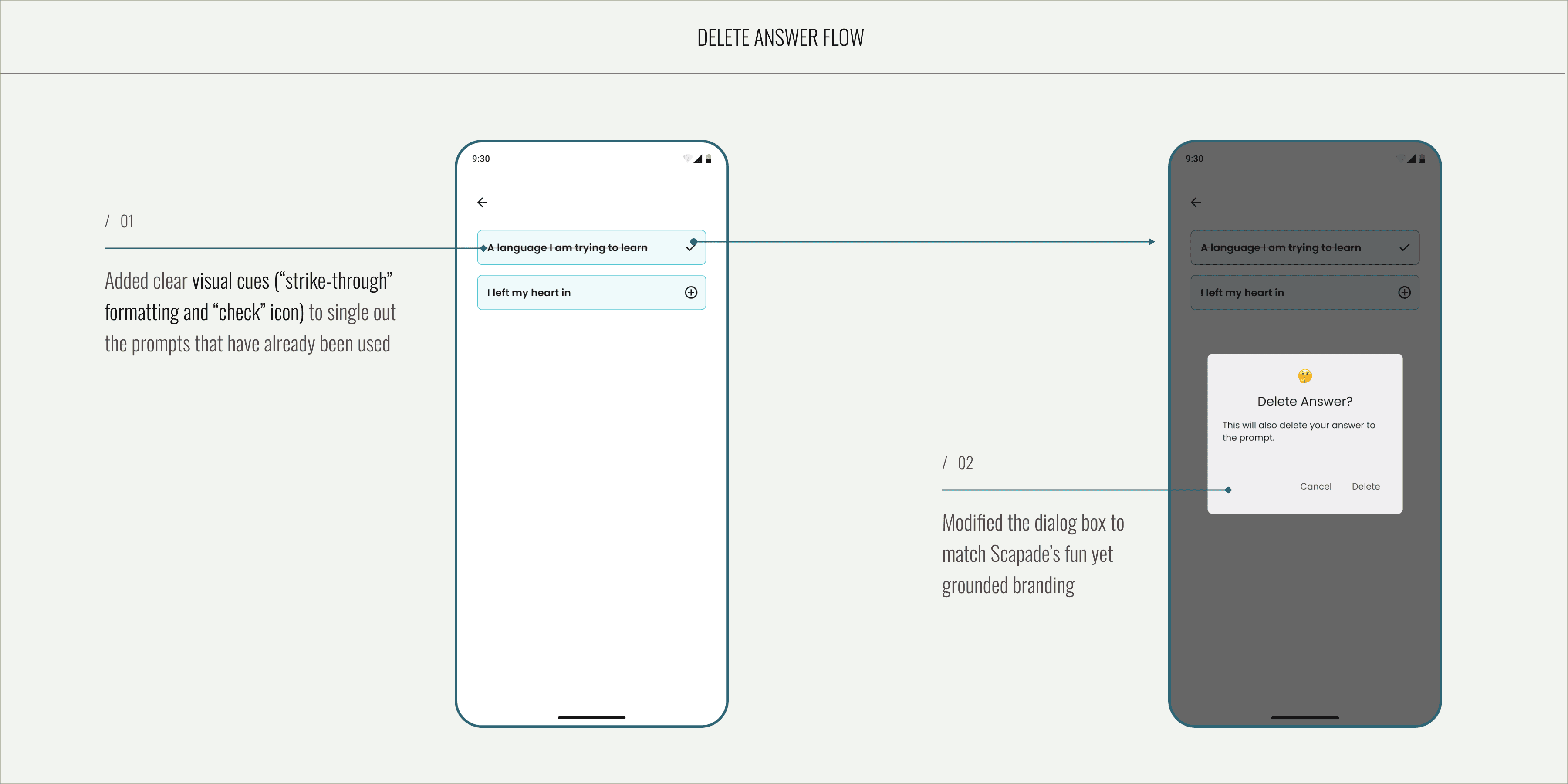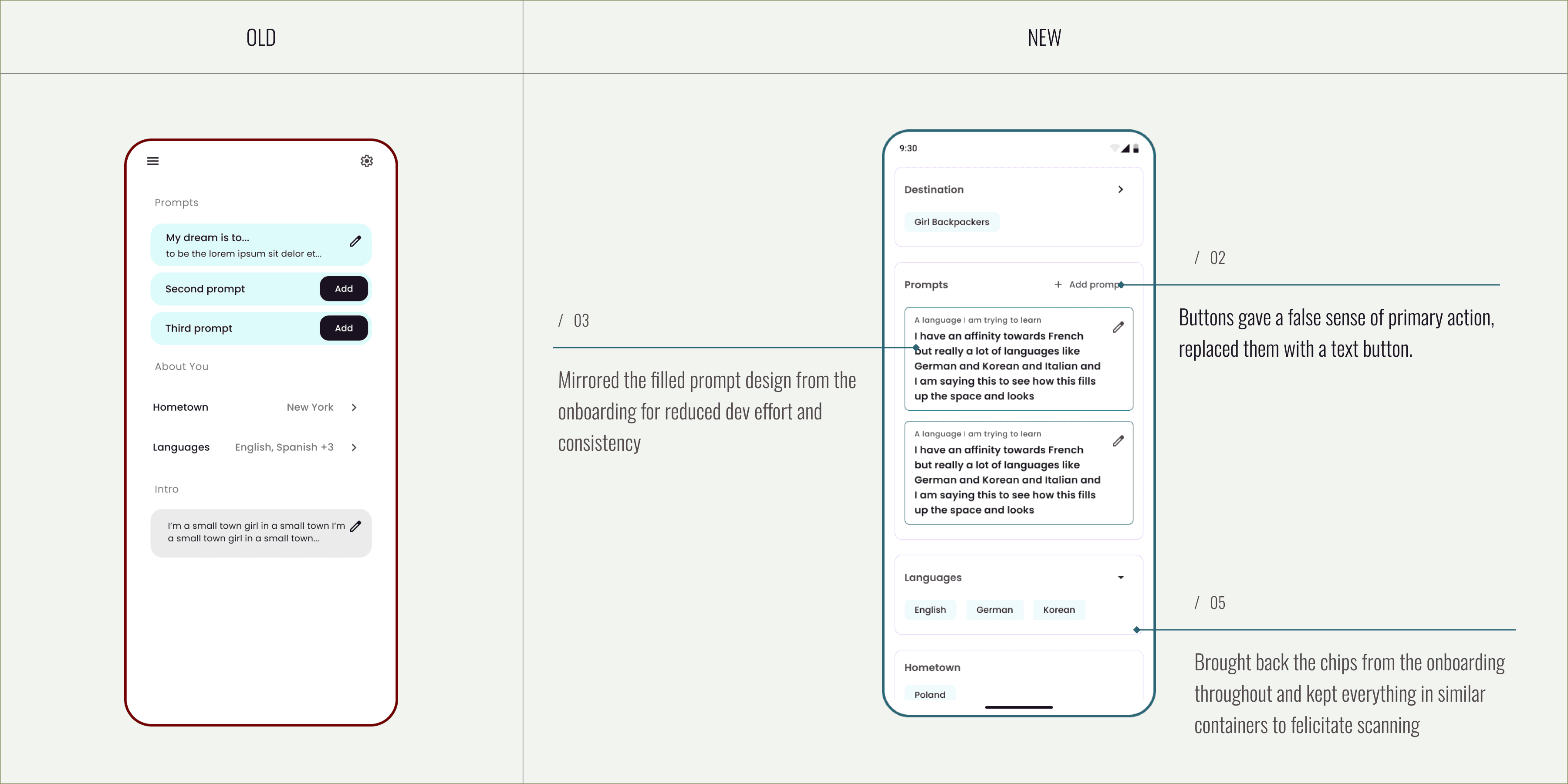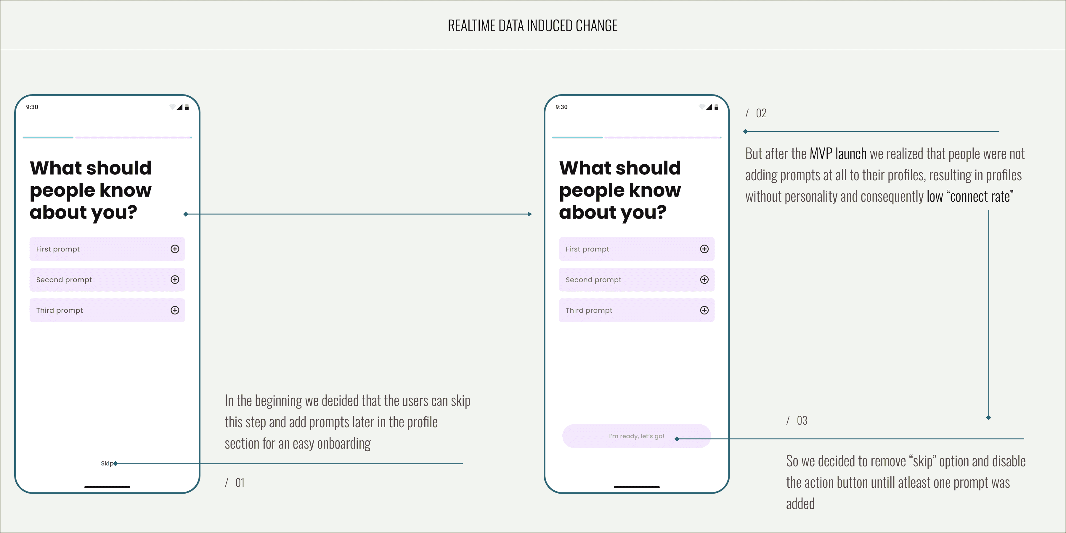 I leveraged post-MVP launch insights to refine the prompt flow, updating visuals and interaction patterns to encourage completion. By replacing the skip action with a disabled primary CTA, the flow now nudges users to add prompts before proceeding.