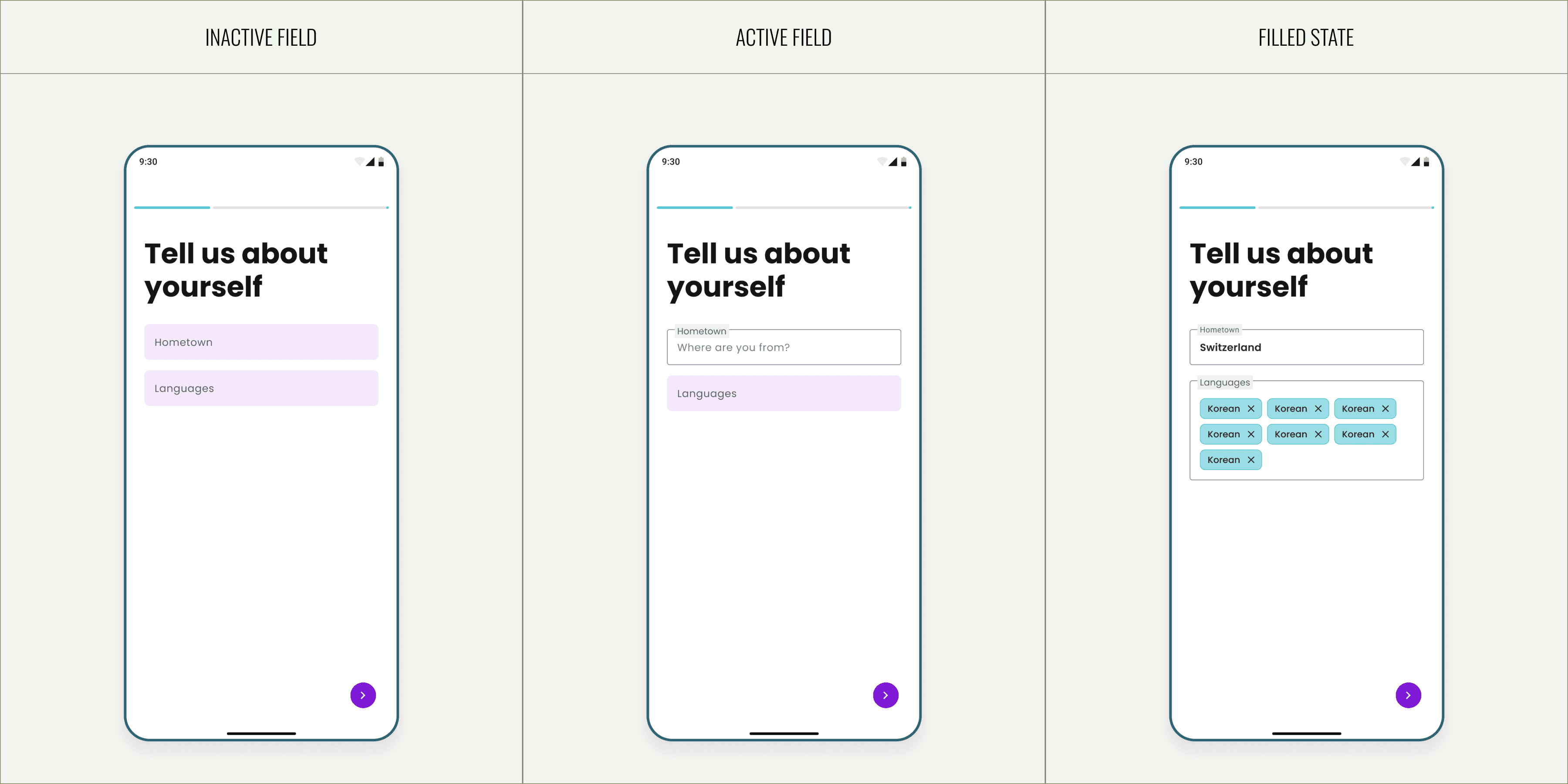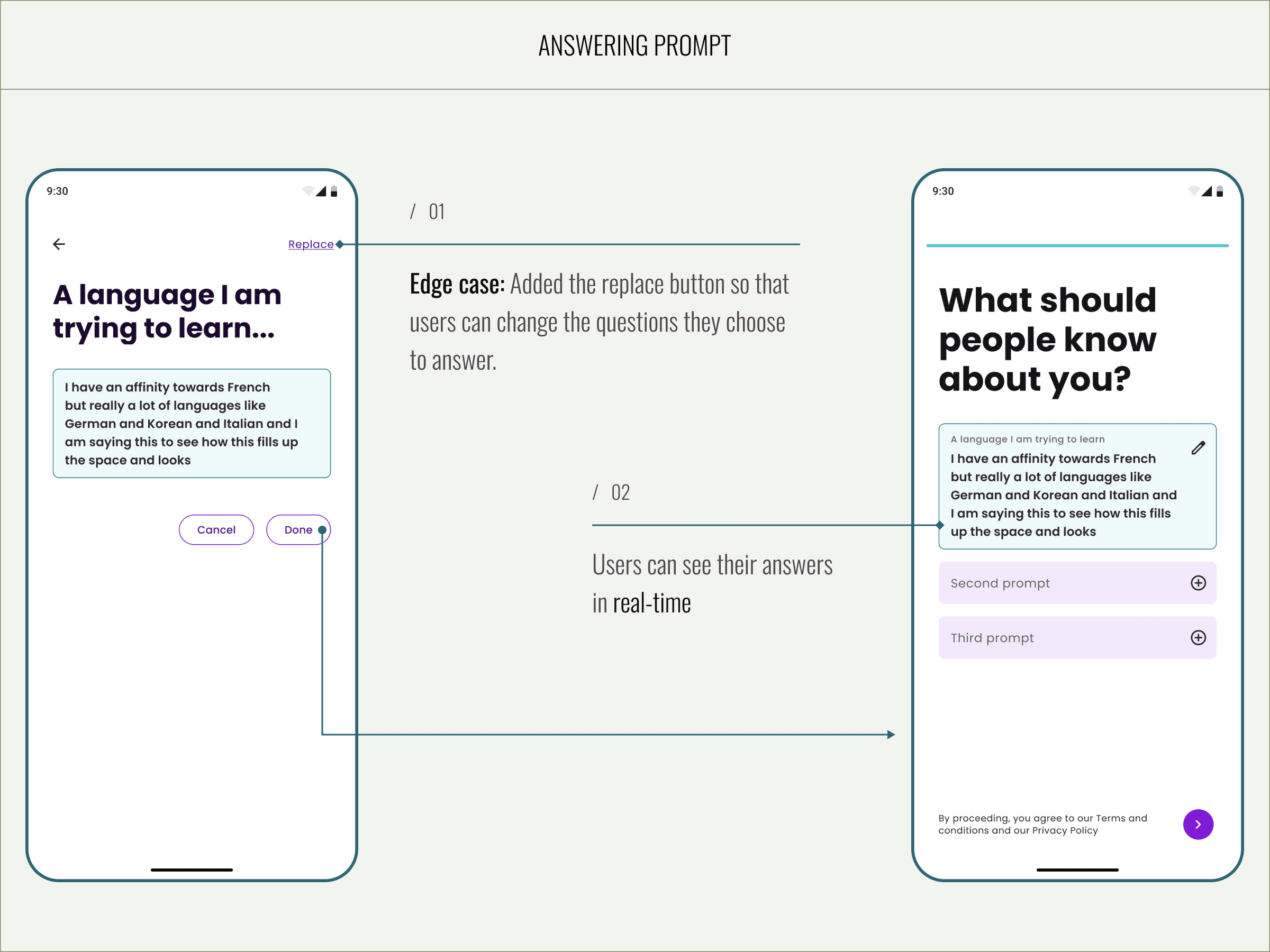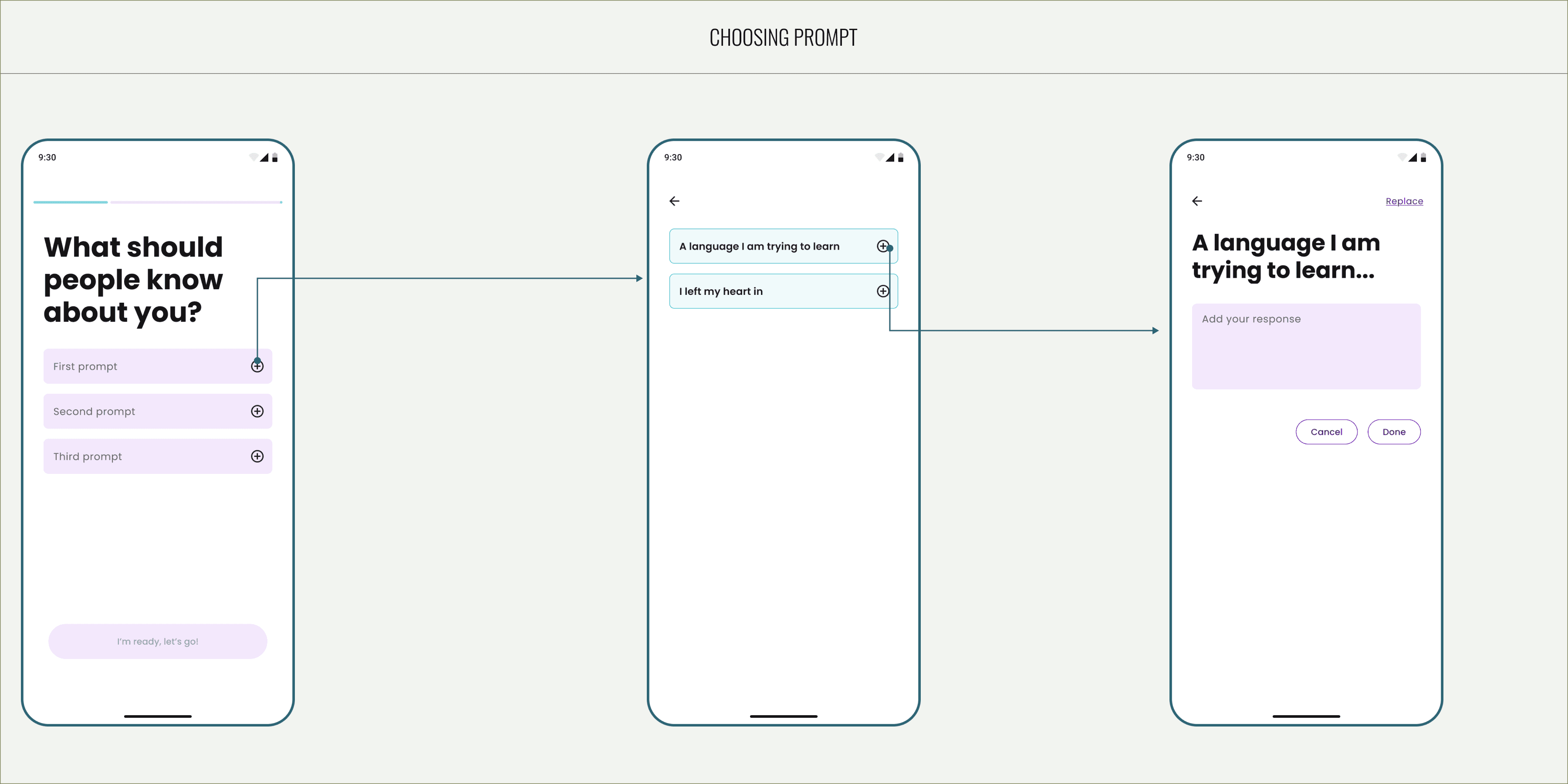 I leveraged post-MVP launch insights to refine the prompt flow, updating visuals and interaction patterns to encourage completion. By replacing the skip action with a disabled primary CTA, the flow now nudges users to add prompts before proceeding.