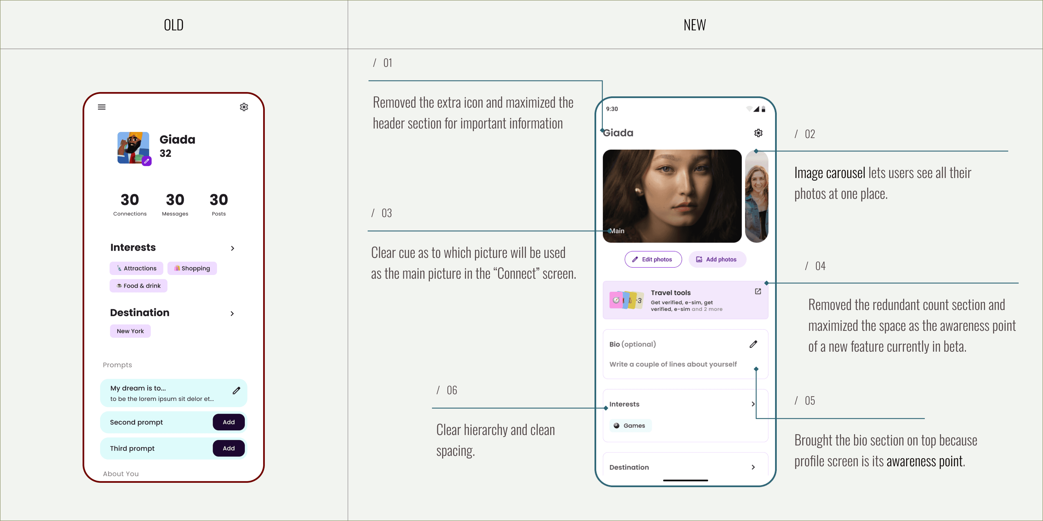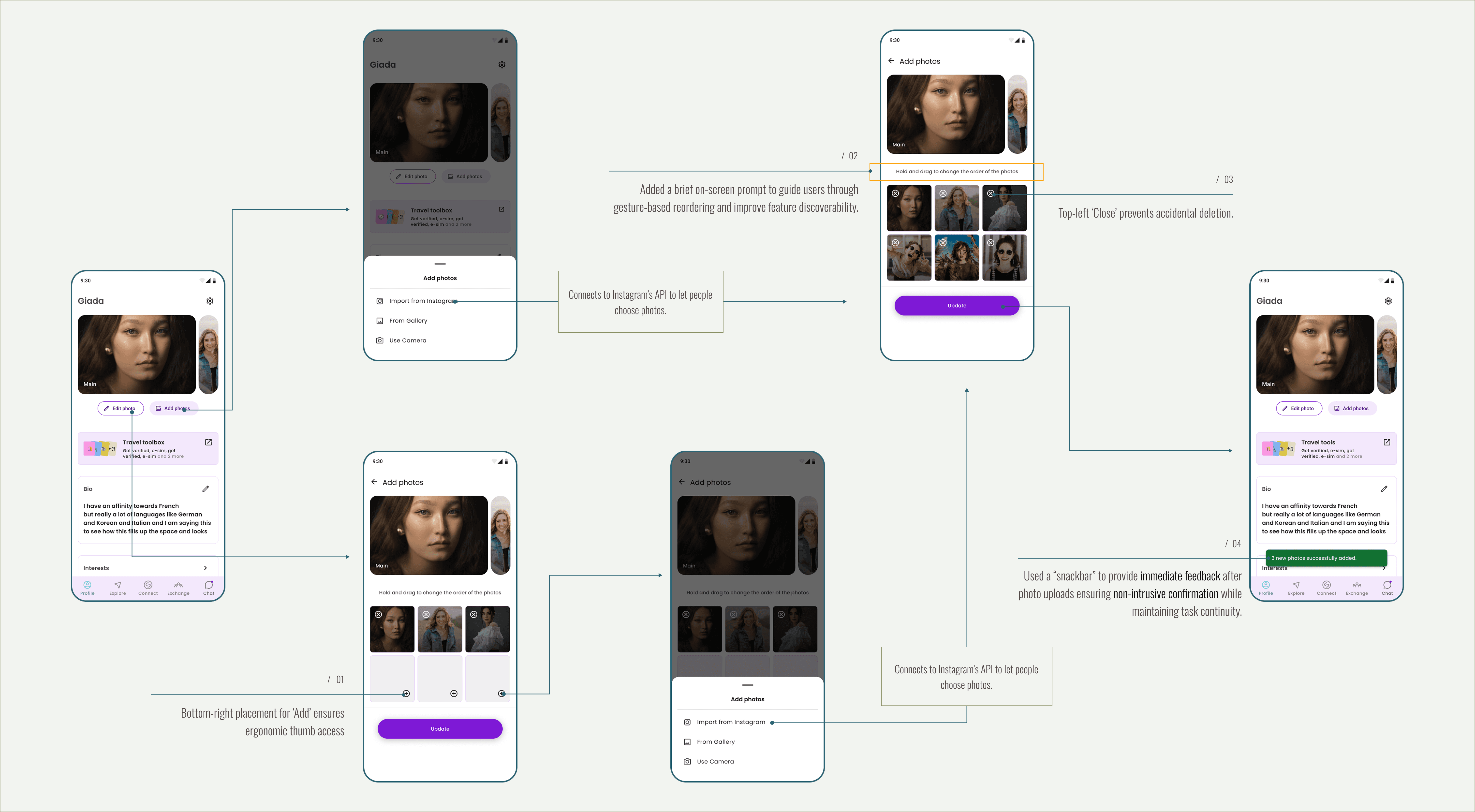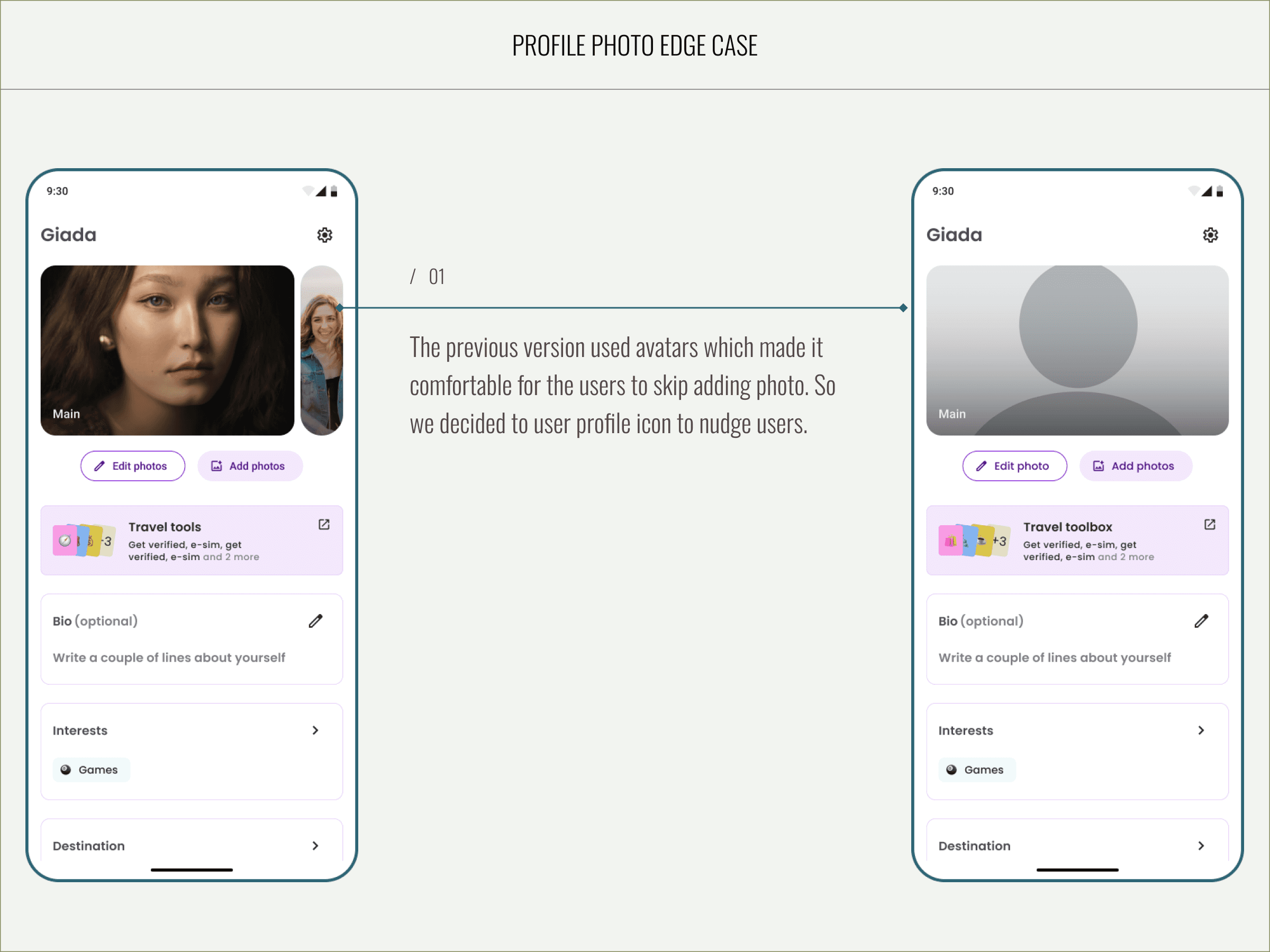 We learned from the user interviews that people would like to see more photos of other profiles to help them decide which profile to connect with.