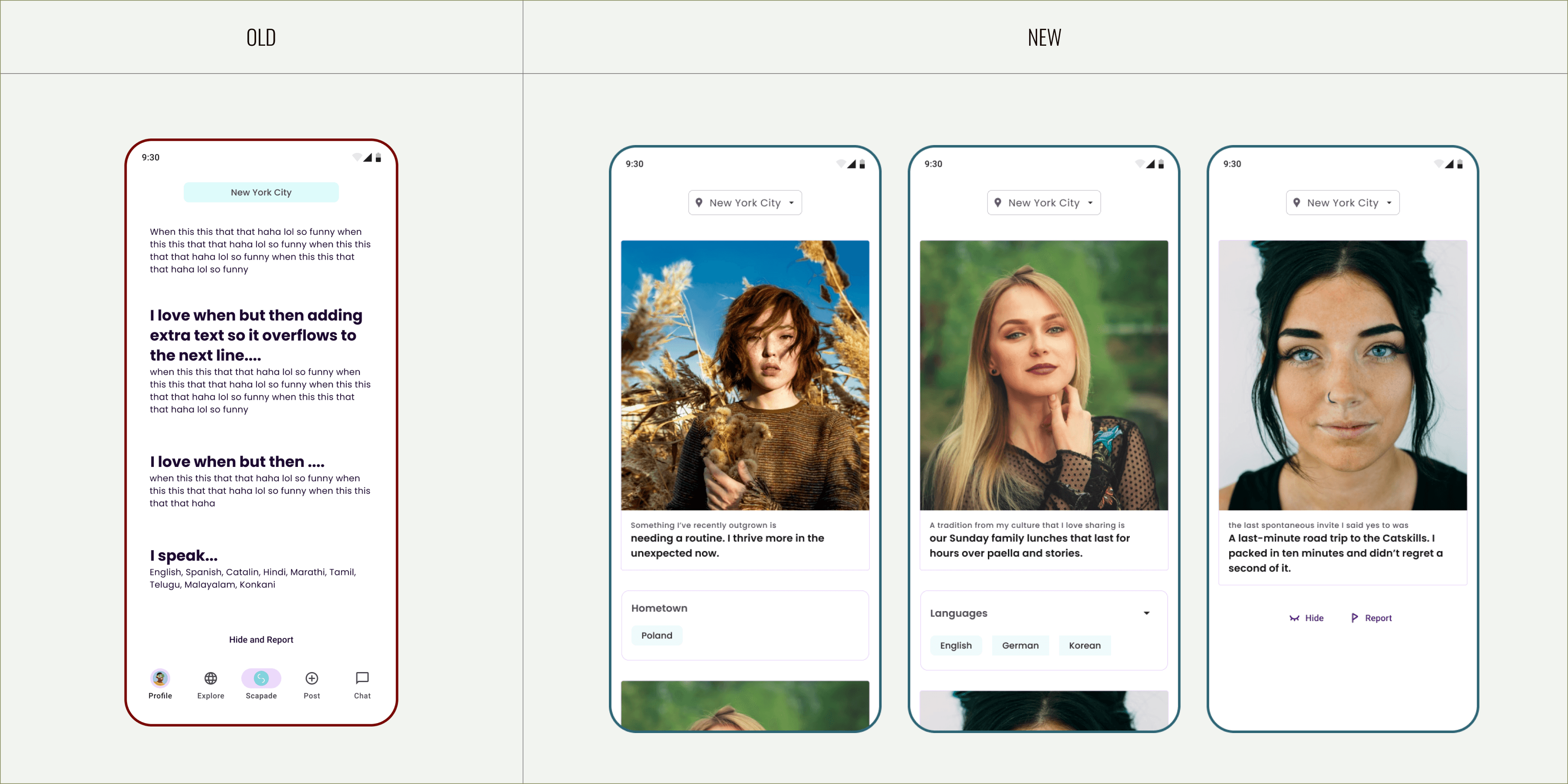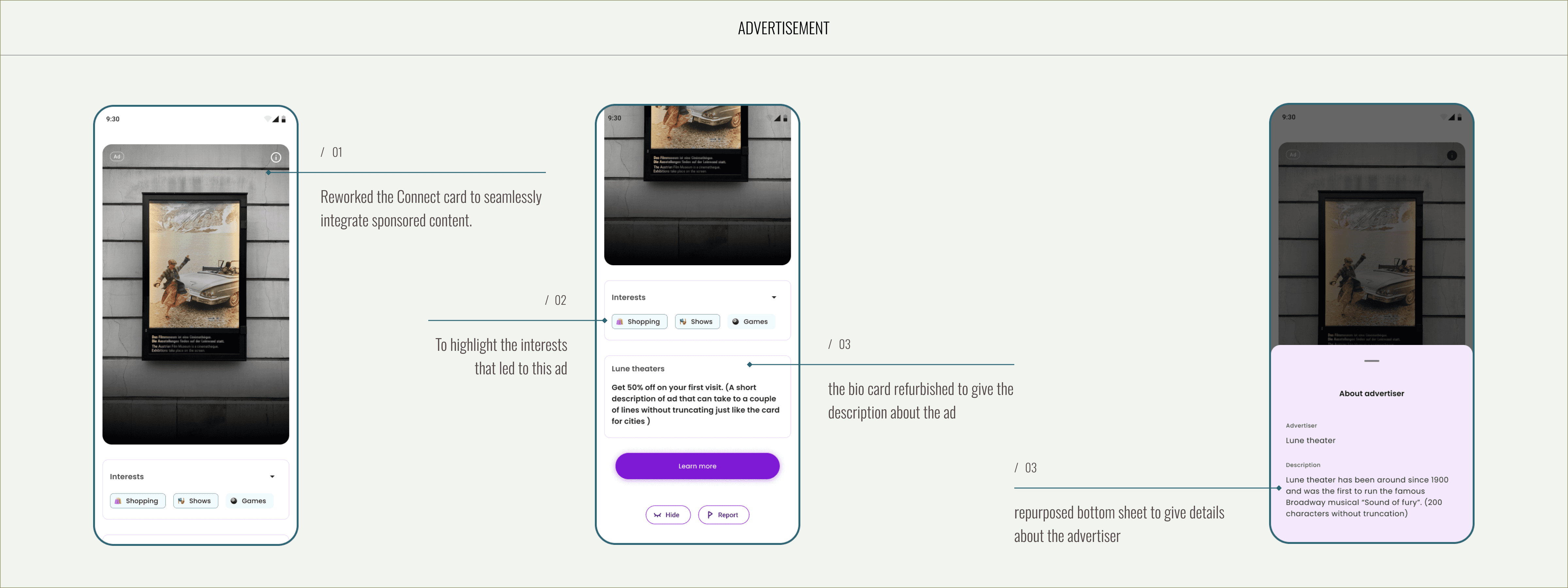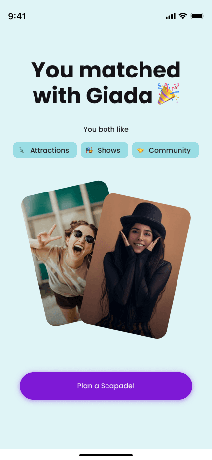 With Scapade preparing to introduce ads as a core revenue stream, I redesigned the Connect card to host sponsored listings in a way that feels natural within the matching flow. This approach ensured that monetization could be added with minimal technical complexity and without compromising user experience.