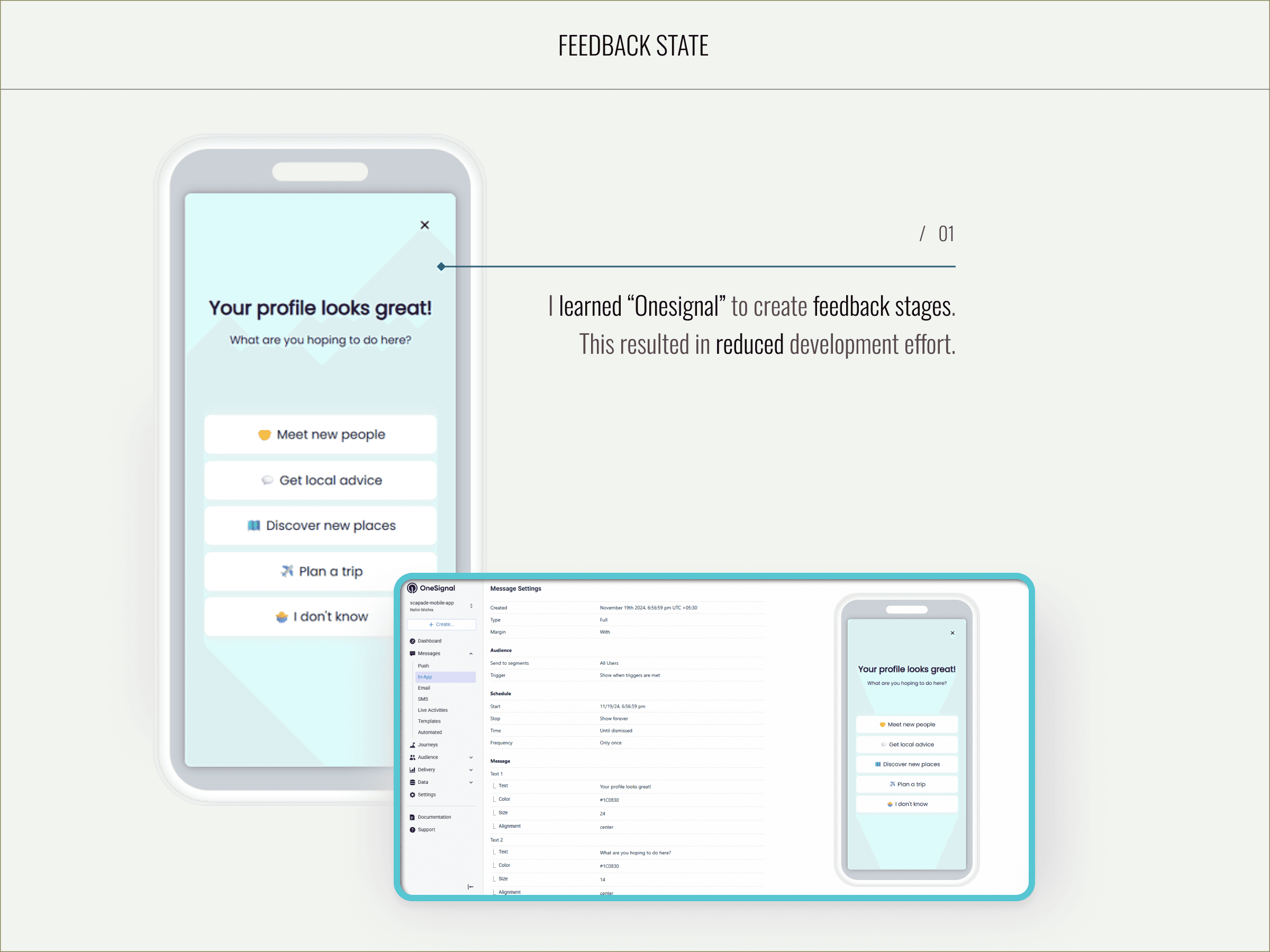 To guide users through Scapade’s core features without adding new code-heavy flows, I designed progressive in-app messages using OneSignal. This not only improved user onboarding and awareness but also reduced development effort by reusing the existing messaging infrastructure.