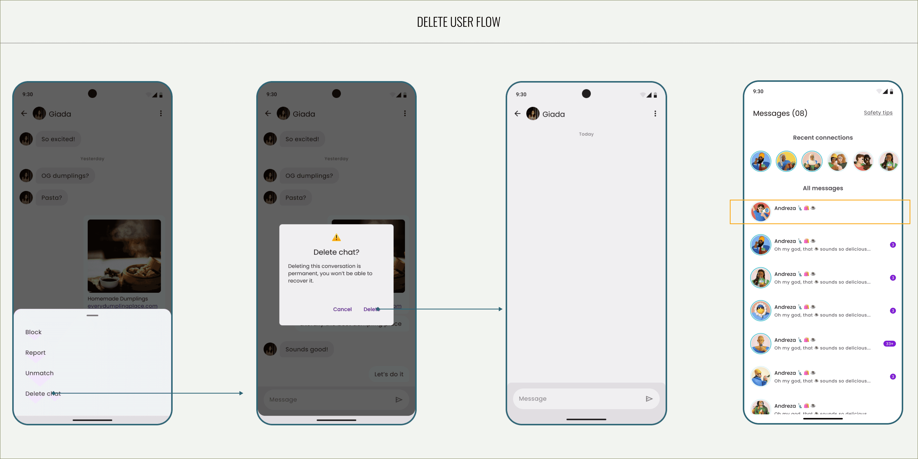 When designing the Report, Unmatch, and Delete flow, my priority was to ensure users felt in control without breaking their sense of safety or comfort. I established a clear hierarchy where “Unmatch” and “Delete” are treated as reversible, self-contained actions, while “Report” leads to a more guided flow that gathers contextual feedback. Each action was accompanied by a confirmation prompt to prevent accidental selections, while microcopy was written in a neutral, empathetic tone to avoid escalating emotional tension. The structure also ensures that users understand the consequences of their actions — for example, that deleting a chat won’t remove a user entirely — helping maintain both clarity and emotional trust.