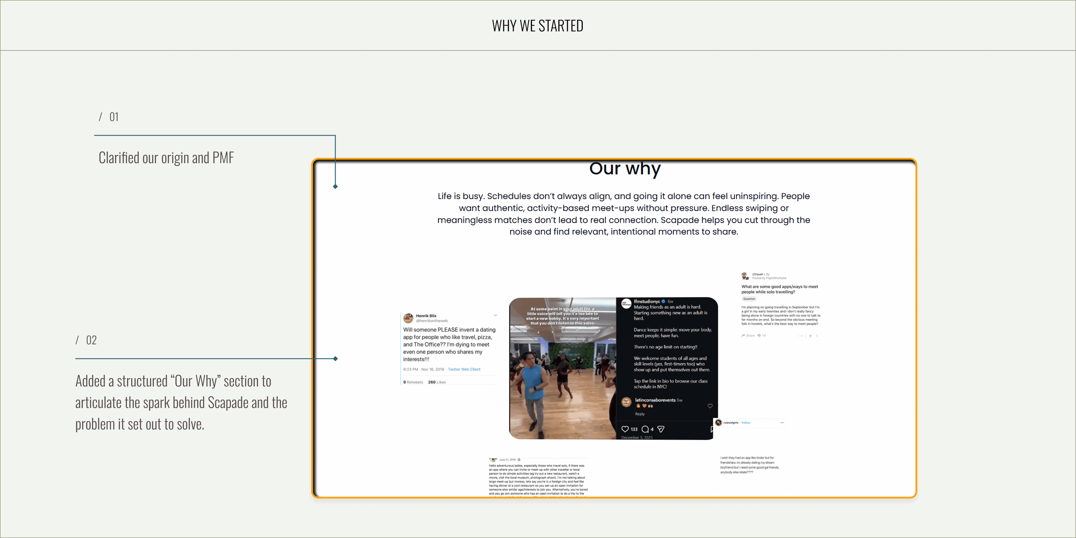 The goal was to humanize the brand, clarify our origin and product-market fit, and make the story feel lived-in rather than corporate.