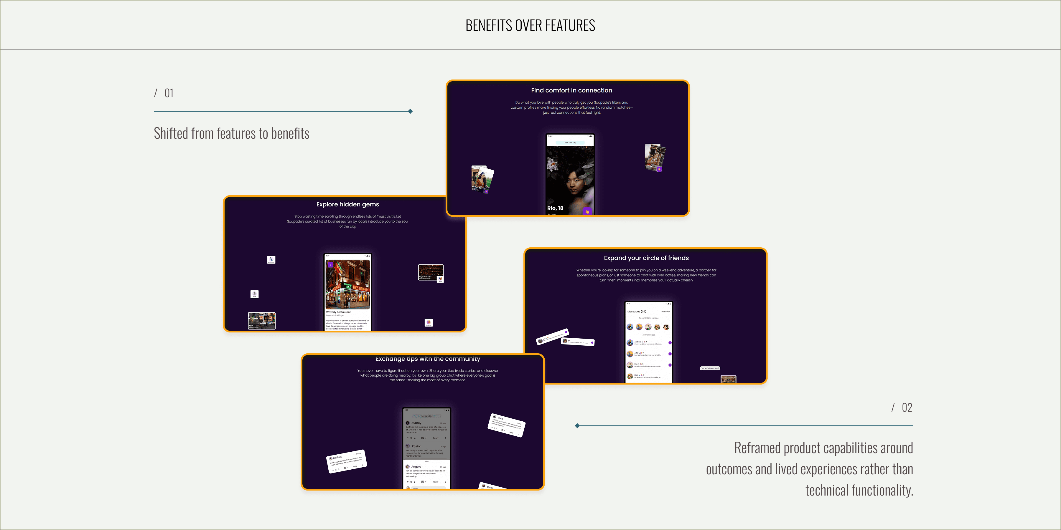 I focused on reinforcing brand personality while clearly articulating how the app improves users’ lives. Rather than presenting functionality at face value, I reframed features as outcomes, emphasizing effortlessness, belonging, and possibility.